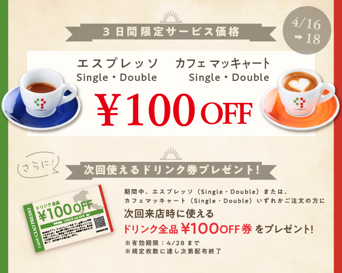 カフェチャオプレッソではイタリアエスプレッソデーを記念して、4月16日からの3日間、気軽にエスプレッソをお試しいただけるおトクなサービスを実施いたします。