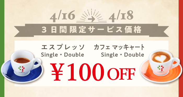 カフェチャオプレッソではイタリアエスプレッソデーを記念して、4月16日からの3日間、気軽にエスプレッソをお試しいただけるおトクなサービスを実施いたします。