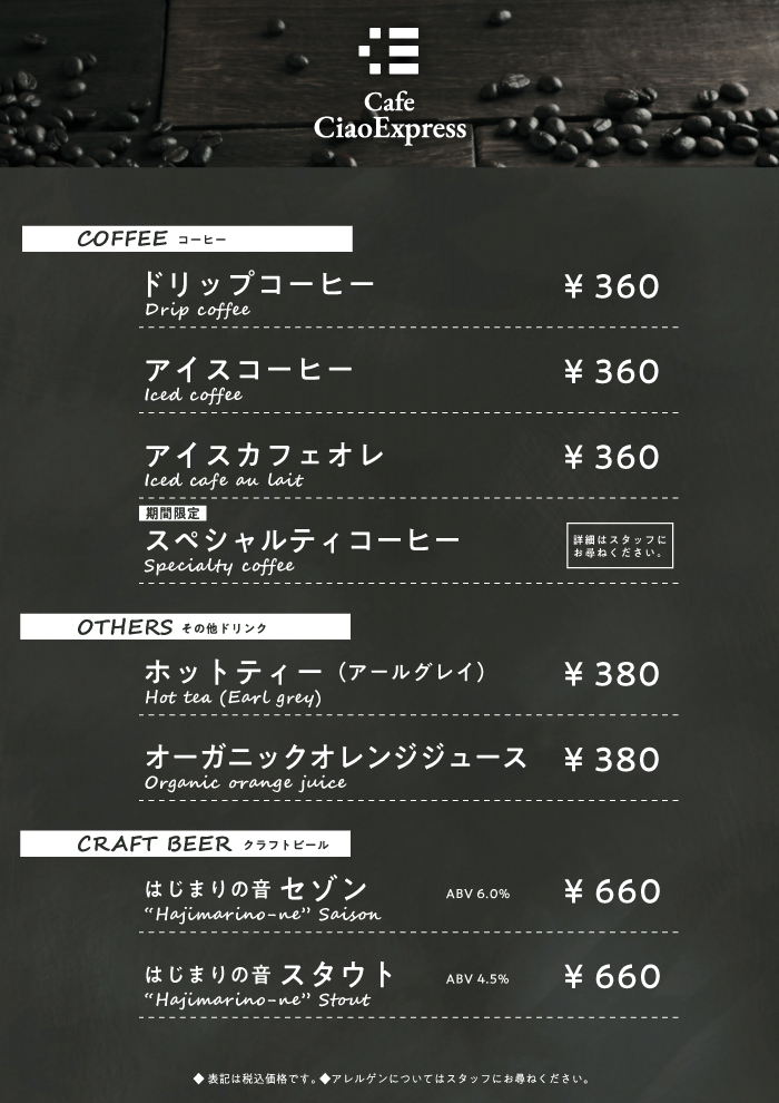 メニューにはバリスタ厳選のチャオプレッソオリジナルドリップコーヒーや、日本バリスタ協会認定の当社バリスタがセレクトしたスペシャルティコーヒーをご用意。