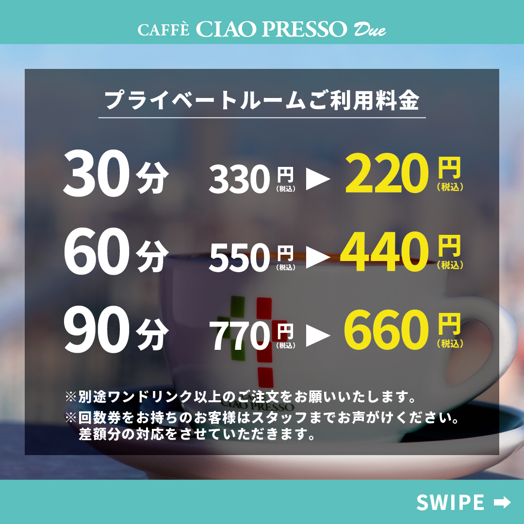 内容:期間中プライベートルームのご利用料金が110円OFFとなります。